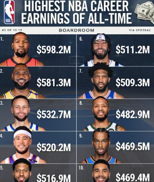 10月20日,根据美国薪资网站Spotrac的数据,刚刚与火箭完成提前续约的杜兰特职业生涯总薪资达到5.982亿美元,超越詹姆斯成为历史第一人!众所周知,在过去很长一段时间里,都有传言称新赛季可能是詹姆斯职业生涯的最后一个赛季,但现在这个数据已经被杜兰特超越,他仍然是詹姆斯曾经的对手。相信一向追求极限数据的詹姆斯也不想看到这一幕。因此,如果詹姆斯正在寻找下赛季打球的动力,这可能是超过他薪水的一个很好的理由。当然,最重要的因素还是冠军。如果本赛季他能随湖人队夺得总冠军,那么就这样吧,詹姆斯很有可能直接退役,但如果湖人队不顺利的话,詹姆斯肯定不会同意!至于工资合同,你也无能为力。尽管詹姆斯是第一名,但他即将被超越。原因很简单。 NBA的估值越来越高。过去10个赛季,球员薪资普遍大幅上涨。越来越多的25岁左右的球星能够拿到价值数亿美元的合同。这在以前是很难想象的。对于现在的詹姆斯来说,数据并不重要。他只是想要一个冠军。今年夏天他甚至与湖人队因为哲学问题发生了冲突。幸运的是,詹姆斯仍然选择留在湖人队,因为他看到了湖人队有机会夺冠。如果湖人队在向新时代致敬的比赛中输球,詹姆斯可能会在赛季中期离队,选择一支更有能力夺冠的球队!