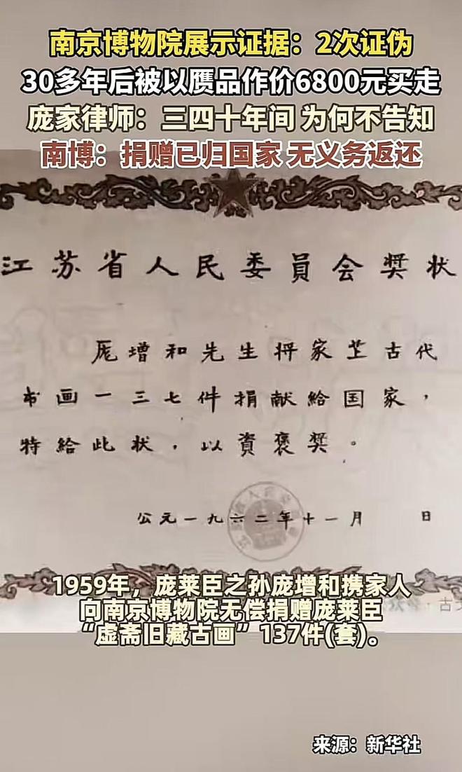 南京博物院:捐赠物已退回国家,无返还义务。最近,南京博物院走红了。也就是说,庞来臣的孙子庞曾爆料称,其祖父当时向南京博物院捐赠了大量古董,全部都是真品。但让他们没想到的是,他们发现一家拍卖行正在拍卖已经捐赠的《江南春》卷轴,估价高达八千八百万。经过深入调查,他们发现之前捐赠的五件古董不翼而飞。对于此事,南京博物院也做出了回应。当时经过专家鉴定,认定这五件文物均为赝品,其中就包括《江南春》画卷。鉴定为赝品后,五件古董被移走。这幅《江南春》画卷是2001年有人以6800元买下的。不仅如此,他们还o 从那时起就贴出了收据,实际上表明它是假的。然而,庞家人仍不满足。他们认为既然你认定是假货,为什么不联系他们退货,而是保密呢?而且他们还坚称这是正品。拍卖行拍卖的8800万张《江南春》卷轴,原来是他们的祖父捐给国家的。没有询问,南京博物院却对此事做出了回应。博物馆告诉我们,这笔捐款已返还给国家,没有义务返还。这就是说,你交给国家之后,就和你没有关系了。他们如何处理是他们的事,他们没有义务联系您或将其退还给您。这个解释绝对有道理,无可辩驳。但现在媒体都在报道这件事,都希望南京博物院能够给出一个解释。如果这只是说说而已,只会带来耻辱去南京博物院。此外,大家还感兴趣的是,拍卖行拍卖的8800万的“江南春”是否是20多年前当地客户以6800元购买的同一件。如果是,它是否可以收回,或者它属于该客户吗?如果真的是那个客户的,那客户就舒心了,直接赚了几千倍。